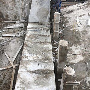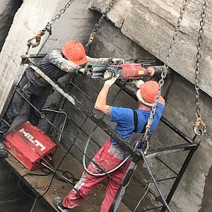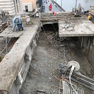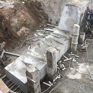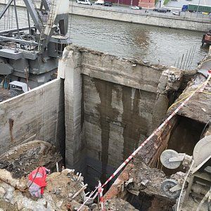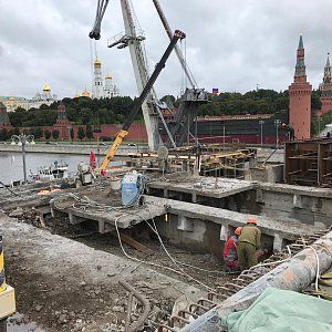 По завершению подготовительных работ для алмазной резки пролетной части моста нам отдали весь русловой пролет под демонтаж. Чтобы нагнать сместившиеся сроки мы оставили на стороне кремля, на которой уже была полностью демонтирована пролетная часть до опоры, одну канатную пилу, работающую 24 часа в сутки. Со стороны области мы выставили дополнительный станок и алмазной резкой начали проводить демонтаж двумя канатными пилами день и ночь. К этому моменту было принято окончательное решение по демонтажу щековых стен большого москворецкого моста. Резка стен проводилась с подиума, а съем демонтированных бетонных блоков двенадцати тонным плавкраном. На береговых пролетах моста демонтаж начал сбрасывать темпы, не успевали подготавливать площадки для резки алмазным канатом. По завершении резки основной части моста заказчиком было принято решение отдать нам под демонтаж береговые опоры. Работы алмазной резкой опор проводились одной канатной машиной и одной бурильной установкой с каждой стороны, с чем прекрасно справились.