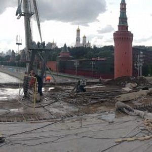 Мы зашли на демонтаж алмазной резкой сначала с 2 канатными пилами и 2 бригадами, работающими в 2 смены. Демонтаж полотна пришлось вести сначала на половине надводной арки большого москворецкого моста со стороны кремля, т.к. с другой стороны велись работы и нужен был еще проезд для техники. И в этот раз алмазной резке не было возможности идти полным ходом, демонтаж основных конструкций моста постоянно прерывали. Что бы канатные машины не простаивали и продолжался демонтаж мы переходили на резку боковых пьедесталов.