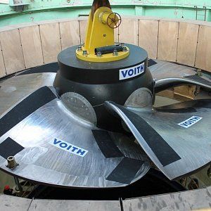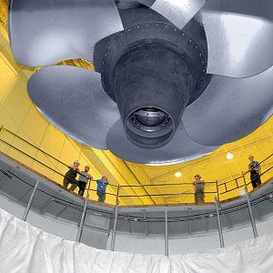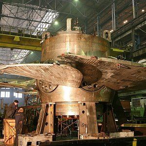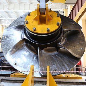 Рабочее колесо турбины Красноярской ГЭС имеет диаметр в 7,5 метров мощностью 6000 МВт и вращается оно с частатой 94 оборота в мин. Нагрузка при этом на монолитную конструкцию в месте