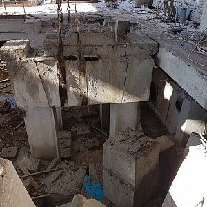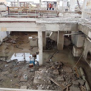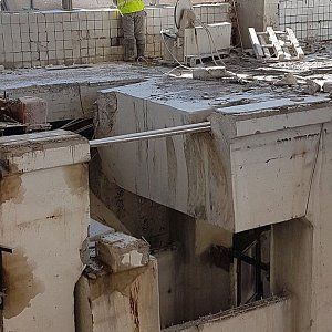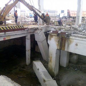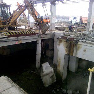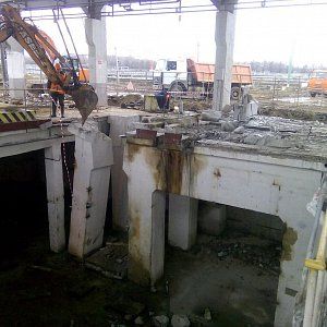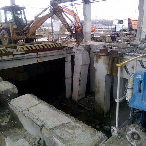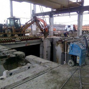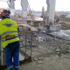 Дальнейший разбор производился экскаватором. За один месяц работы было демонтировано 300м3 железобетона, погрузка в Камазы отрезанных частей производилась штатной кран-балкой, что значительно сократило время погрузки. Резка бетона прошла стандартно без осложнений, вода была в свободном доступе, электричество также без проблем было предоставлено заказчиком. Единственное из сложностей можно отметить сложную пропускную систему, это связано с тем что Курьяновские очистные сооружения являются стратегическим объектом и чтобы провести работы необходимо было пройти проверку службы безопасности как нашей фирме, так и каждому отдельному сотруднику.