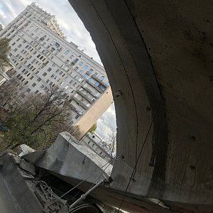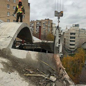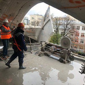 Ювелирность в проведении работ потребовалась от нас и заказчика при проведении работ над пешеходной зоной. Демонтировали арку входной группы диаметром 4000 мм. Резать пришлось на сегменты массой до 500 кг.