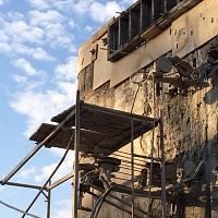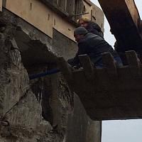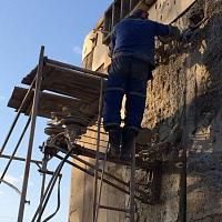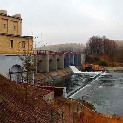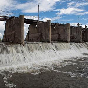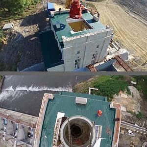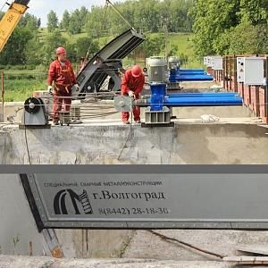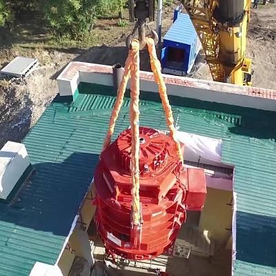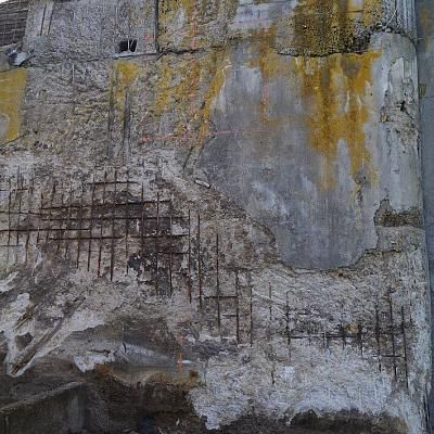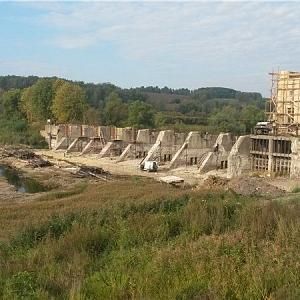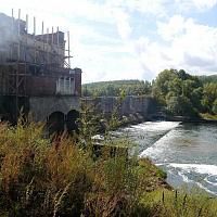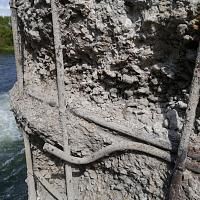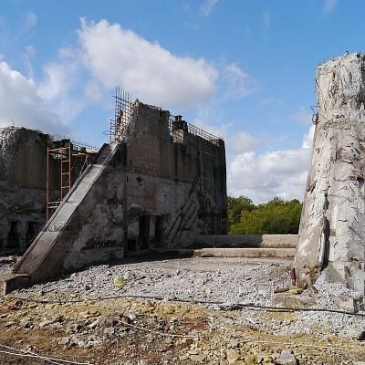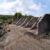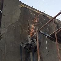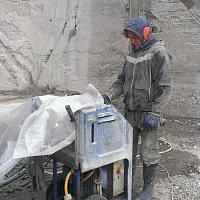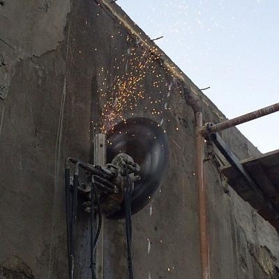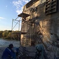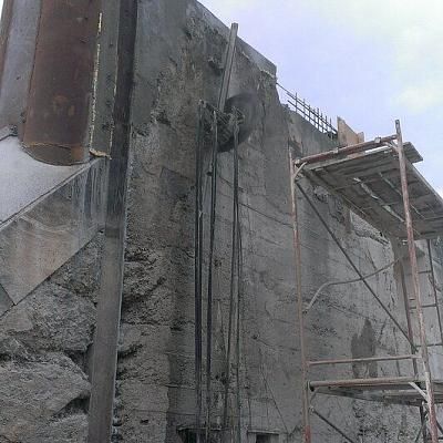 Мы приступили к работе. Разметка к нашему приезду уже была нанесена на стенки быков (несущих элементов конструкции водопропусных гидротехнических сооружений). После сборки лесов и произведя пробную резку железобетона мы открыли для себя несколько нюансов. Алмазная резка плотин, водозаборов, ГЭС и других гидротехнических сооружений сопряжена с определённой сложностью. Ну во первых степень армирования в сооружениях такого плана очень высокое, так как конструкция должна быть с запасом прочности и долговечная. Во вторых в данном виде гидротехнических сооружений используется бетон повышенной прочности по тем же самым причинам. Так как у нас это был первый объект по резке бетона на плотине мы это не учли и заложили в расчёт стоимости и сроков ручной инструмент (бензорезы и электрорезчики) в результате пришлось сделать дополнительную ходку за стенорезной гидравлической машиной и с помощью этого мощного, грозного оборудования мы поставленные сроки выполнили поставленную нам задачу. Немного о самом процессе: алмазная резка железобетона стенорезной машиной производилась как и в горизонтальной плоскости ( по полу) так и по самим быкам ( в вертикальном положении). Для резки необходимо большое количество воды, её брали непосредственно из реки Зуша используя погружной насос. Мощность машины 20кВт. 380В, диск применяли Д 800мм, так как быки надо было прорезать на 200мм вглубь. Также при выборе штробы столкнулись со сложностью, бетон из нее выбивался очень тяжело. Было принято решение делать дополнительный рез посередине штробы ширина её составляла 450мм. После того как дополнительные реза были выполнены, демонтаж бетона пошёл значительно легче и быстрее. При резке сквозных окон нами была применена технология канатной резки так как сработать надо было без ЗАПИЛОВ (зарезы от дисковой пилы). Деление бетона в вырезаемых окнах мы решили сделать по месту применив фигурный рез алмазным канатом для чего использовали дополнительные стойки и ролики. Деление бетона было необходимо для облегчения массы "вываливаемого" куска и чтобы это самое вываливание облегчить. В результате вываливать уже поделенный на 4-ре части бетон пришлось с использованием экскаватора (см. фото). Когда работы были завершены, демонтированный бетон был вывезен для дробления в щебень.