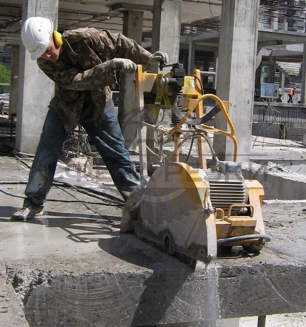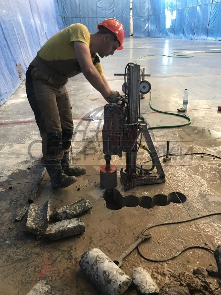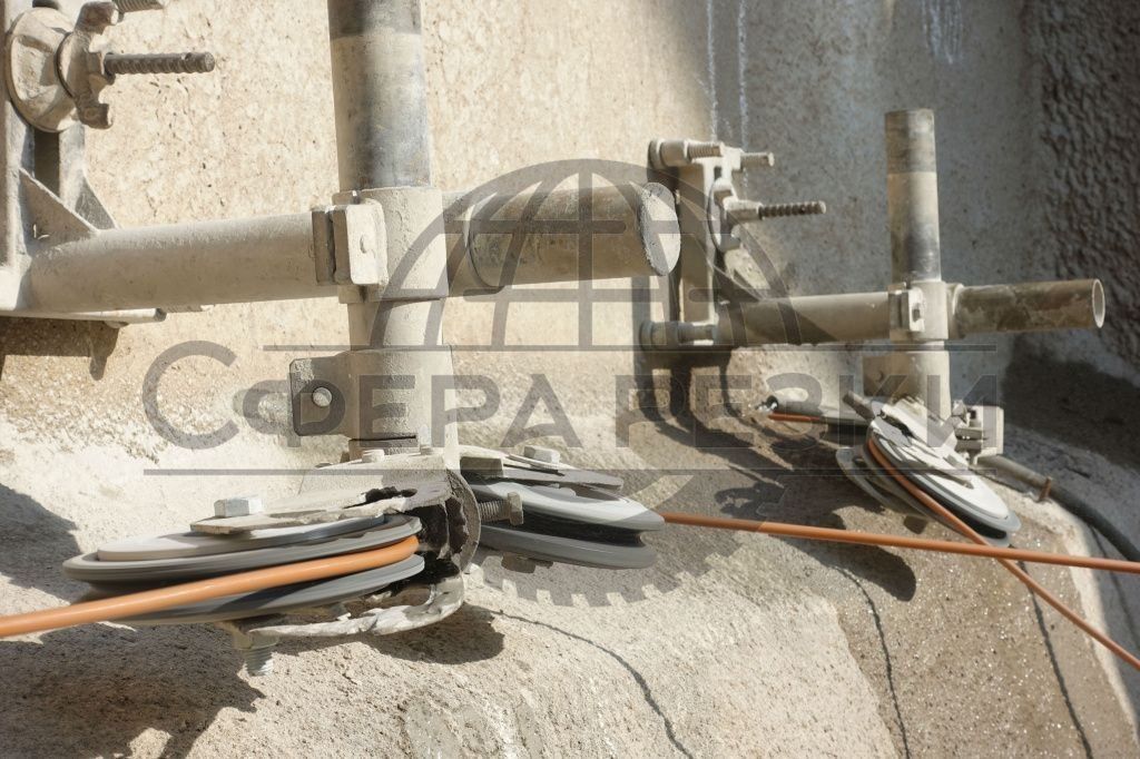 Sometimes the path of the cutter have to be laid. For this, a special hydraulic machine is used. Workers calculate the locations of the holes, lower the machine and it drills precisely and accurately. Then a wire saw is launched into these holes, and it begins to cut. Not only a smooth path is possible, but any, from oblique lines to even a zigzag.