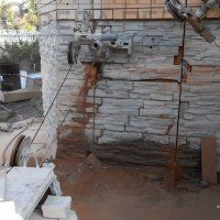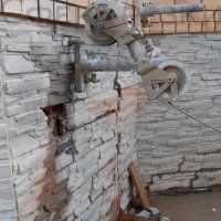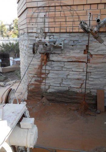 Канатная резка кирпича производится с постоянной подачей воды в область реза. Так как кирпич материал сильно "образивный" то расход алмазного каната при резке стен достаточно высокий. Но благодаря тому что как правило армирование кирпичных стен производится очень редко, то этот самый расход намного меньше чем при резке тяжелоармированного бетона.