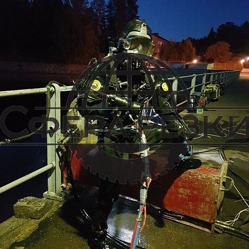 Канатная резка железобетонных гидротехнических сооружений производится с применением профессионального снаряжения для работы под водой.