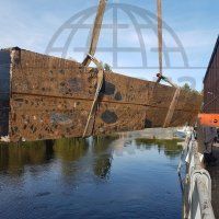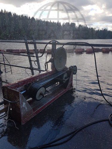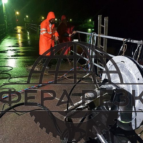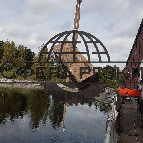 Сама резка под водой процесс достаточно специфический, так как вода имеет сопротивление и замедляет вращение каната как вокруг оси так и вдоль траектории резки, наша команда применяет машину повышенной мощности и специальную оснастку на накопителе. По нашему запросу была изготовлена партия резиновых бандажей для роликов в которых применён усиленный состав резины, позволяющий выдержать давление и трение алмазного каната при работе с гидроагрегатом повышенной мощности. Резка происходит в среднем в 3-4 раза медленнее чем на суше, но тем не менее технология подводной резки железобетона нашей компанией отработана и мы без проблем выполняем её по всей России.