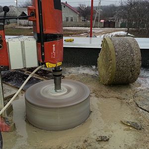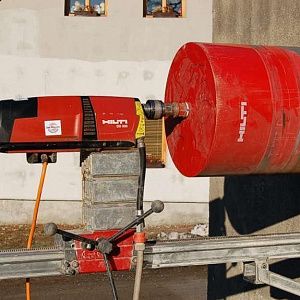 Для бурения отверстий большого диаметра (Д от 400мм) применяются установки алмазного бурения мощностью 6кВт 380В или гидравлические машины алмазного бурения. Как правило сверление больших отверстий применяется там где есть строгие доступы по отверстиям и нельзя применить метод выбуривания большого диаметра серией маленьких. Так как после бурения отверстия большого диаметра остаётся керн (выбуренный кусок) большой массы, то часто до начала бурения отверстия большого диаметра буриться в нём же отверстие малого диаметра чтобы облегчить керн.