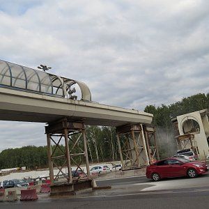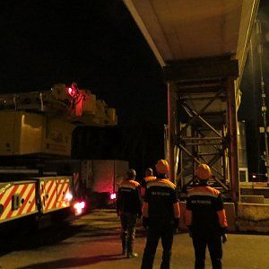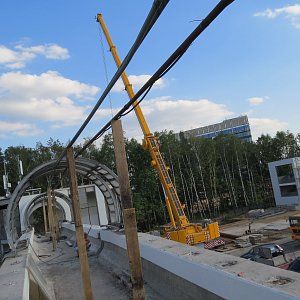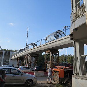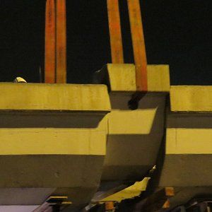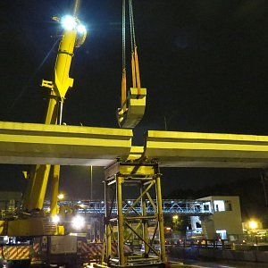 Сложность возникла на пешеходном переходе на Киевском шоссе. Так как работы проводились без остановки движения транспорта, но сам съём отрезанных сегментов производился 300тонным кранам и уже для этой операции депортаментом транспорта были строго отведенные часы.
